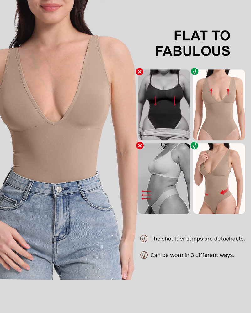 • 3D Bust Support: The deep V-neck cut and built-in soft molded cups naturally support the bust, creating a rounded and full bust shape. It prevents stuffiness and pressure on the chest, while also concealing underarm fat for a cleaner, more streamlined look.