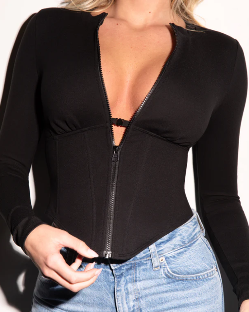 • Long-sleeved, waist-cinching top with shaping boning.