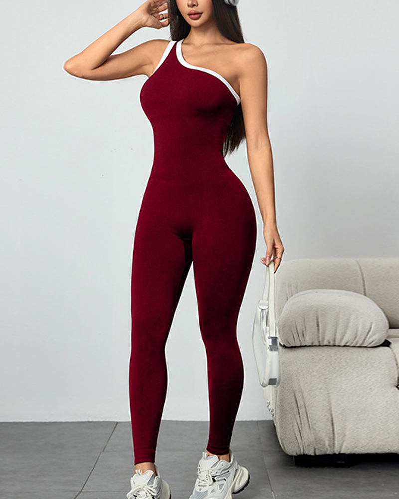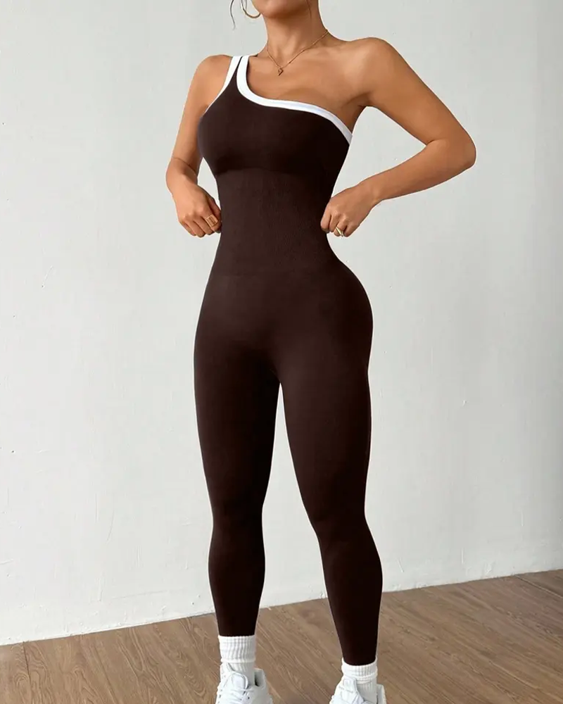 Stylish Slim-Fit Color-Blocked Asymmetrical Neckline Knit Yoga Jumpsuit