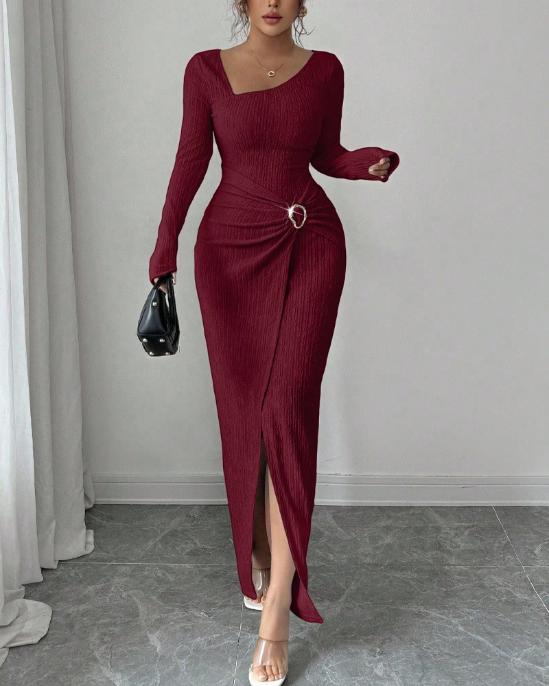 Irregular Neckline Solid Color Knit Texture Long Sleeve Maxi Dress