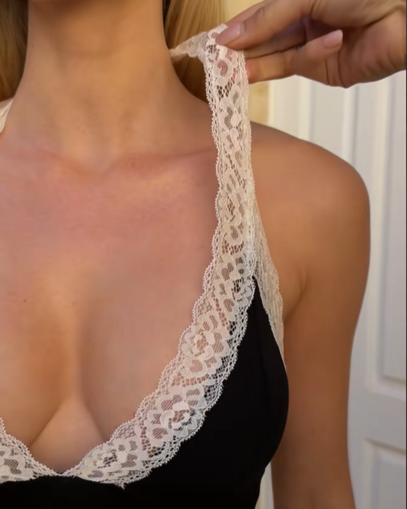 This jumpsuit features a sleek, cropped cut and is adorned with delicate lace. The perfect length flatters the figure, and the premium modal fabric, with its slight stretch, creates a beautifully contoured silhouette. The halter neck design, along with the contrasting lace detailing at the neckline and hem, highlights its refined details and modern appeal.