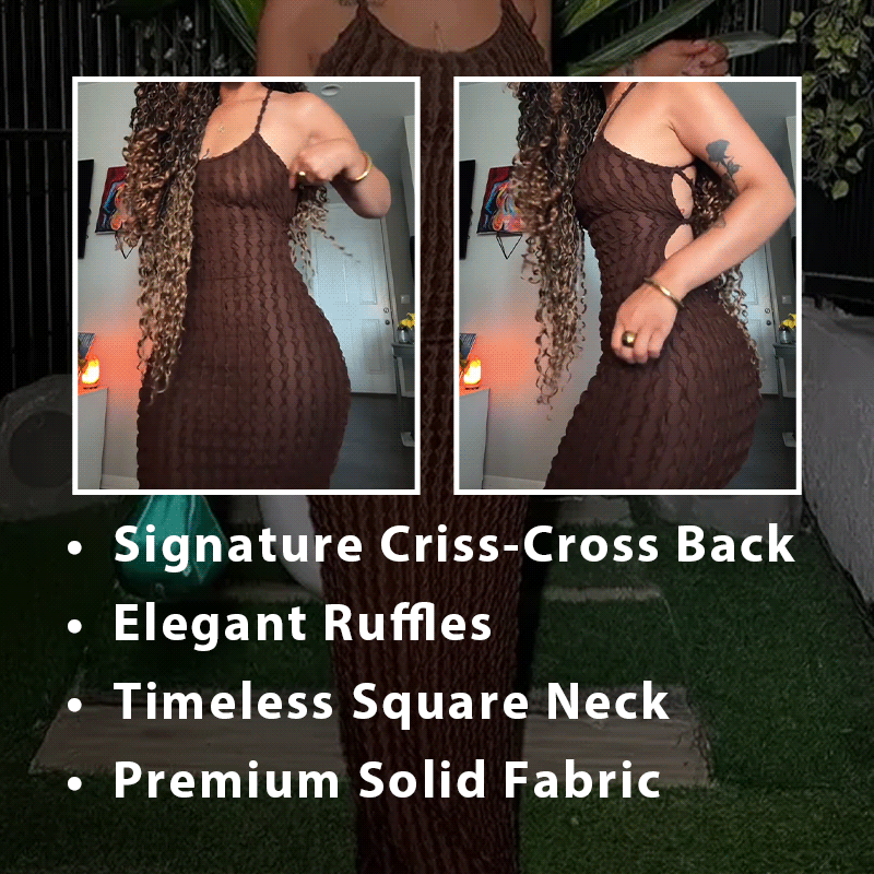 Forget the ordinary. This dress is designed for the moment you walk away. Its defining criss-cross back creates an architectural, yet effortlessly feminine silhouette that captivates from behind. Delicate ruffles frame the sleeves and hem, adding a touch of soft movement with every step.