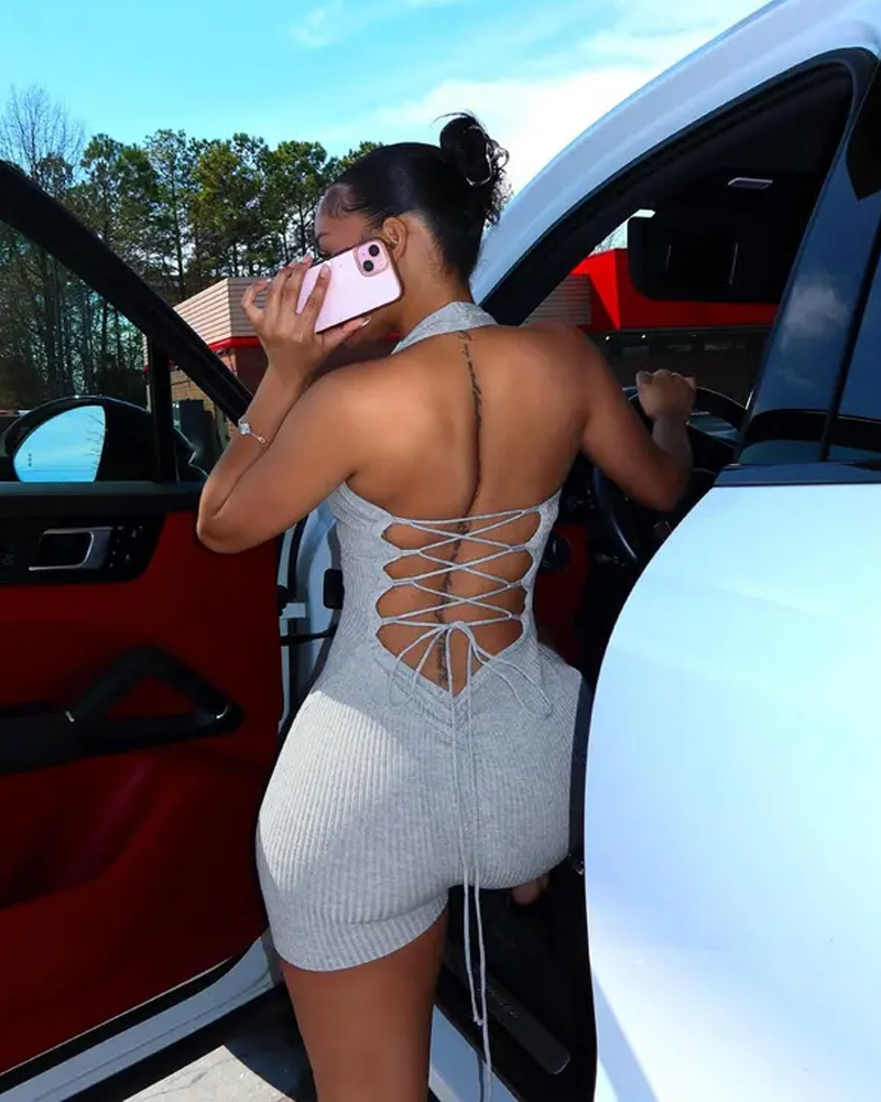 Deep V-Neck Halter-Neck Backless Jumpsuit With Drawstring Detail.