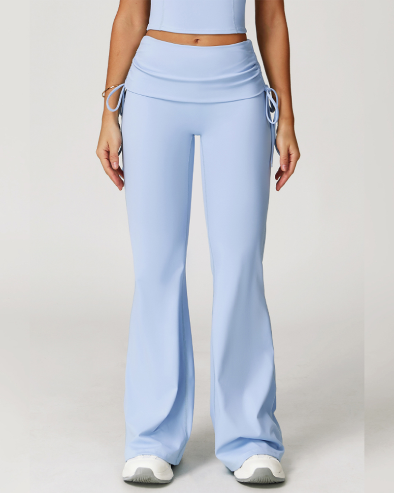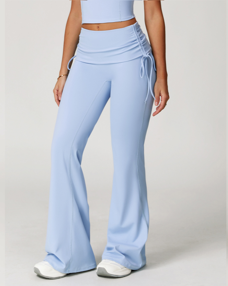 These flared pants feature a high-waisted, folded design, side drawstring pleats, and a buttery-soft fabric, making them ideal for yoga, fitness, and casual streetwear.