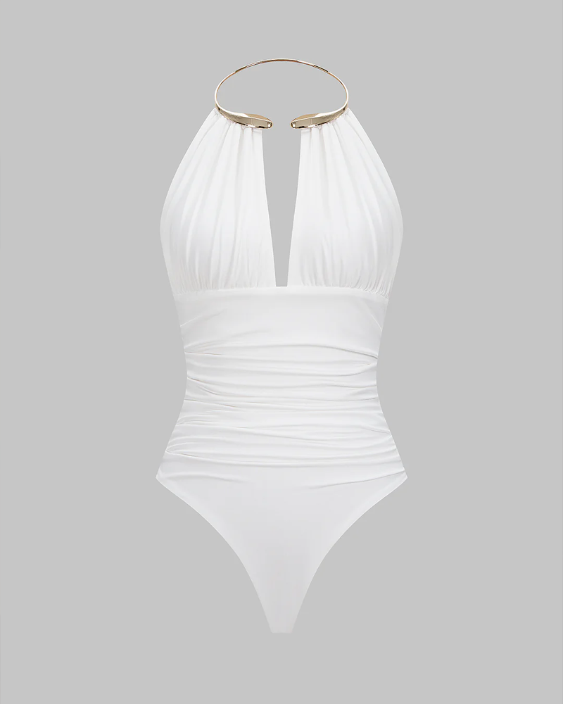 Metallic Decor Halter Neck Ruched Sleeveless Backless Bodysuit(Pre-Sale)