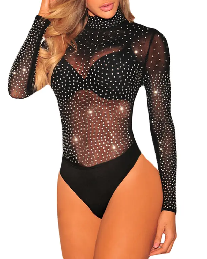 Rhinestone Sheer Turtleneck Long Sleeve Bodysuit (Pre-Sale)