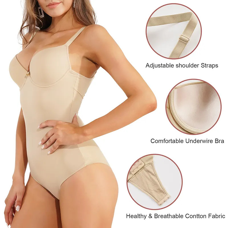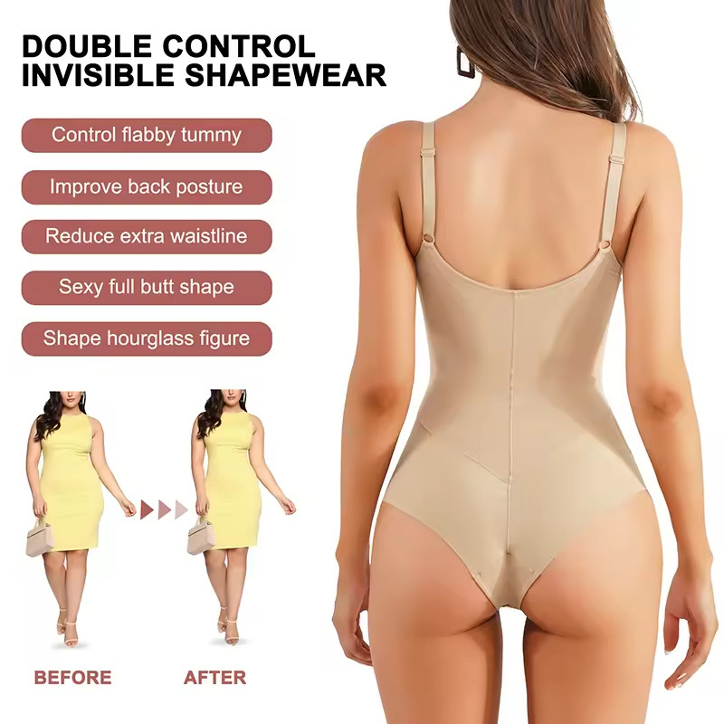 • V-neck bodysuit shapewear with adjustable straps, hourglass bra shapewear with V-neck bra and adjustable straps. This seamless tummy control shapewear is adjustable to fit the body perfectly, as the slimming bodysuit can be removed as a strapless shapewear bodysuit or worn as a cross-bodysuit top. The straps of the comfort support bodysuit can be replaced with transparent straps for off-shoulder dresses. This sturdy bodysuit makes you more attractive and shows your feminine charm under any clothes.