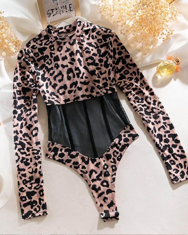 Leopard Print Slim-Fit Long-Sleeved See-Through Bodysuit