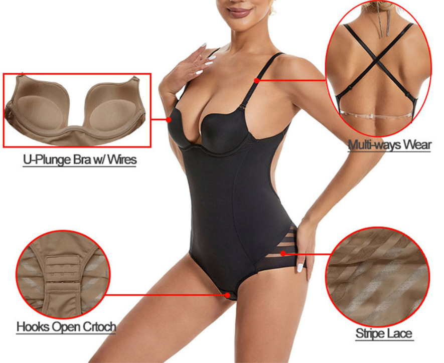 U-Shaped Low Cut Body Shaper with Adjustable Straps, U-Shaped Low Cut Body Shaper with Comfortable Built-in Bra. This body shaper has 2 adjustable, removable straps and 1 back strap, allowing you to perfectly adjust it to fit your body. This thong body shaper for women is made with three-dimensional cups, which are more skin-friendly, comfortable and supportive, and will not let the cups deflate, shaping beautiful curves.